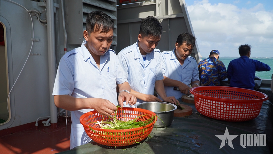 Chia sẻ về công tác bảo đảm hậu cần cho chuyến đi, Thiếu tá QNCN Trần Quốc Toản cho biết: “Khi xây dựng kế hoạch bảo đảm hậu cần, chúng tôi tính toán rất kỹ trên cơ sở quân số thực tế, có phương án trừ hao hợp lý. Từ đó bảo đảm đủ lương thực, thực phẩm cho suốt chuyến đi, từ thực phẩm tươi sống đến rau củ quả, đáp ứng tốt đời sống bộ đội trong hải trình dài ngày”.