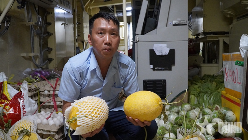 Thiếu tá QNCN Trần Quốc Toản, Bếp trưởng Tàu 17 cùng các đồng đội luôn tất bật từ sáng sớm đến tối muộn. Không chỉ bảo đảm ba bữa ăn đầy đủ, đúng tiêu chuẩn mỗi ngày, công tác bảo quản thực phẩm tươi sống, rau củ quả trong điều kiện không gian hẹp, độ ẩm cao và thời gian kéo dài được xem là một trong những nhiệm vụ khó khăn nhất đối với những người lính nuôi quân.