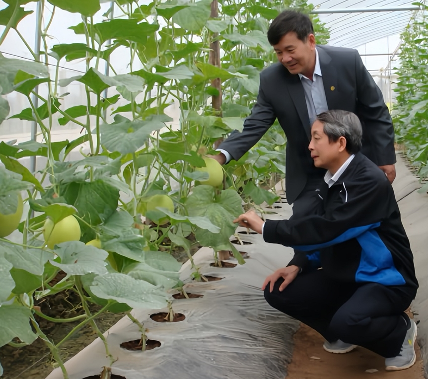 | GS Trần Đình Long (ngồi) tại mô hình trồng dưa lưới trong nhà kính ở Khu công nghệ cao Hà Nam (Tập đoàn Vina Seed). Ảnh do nhân vật cung cấp |