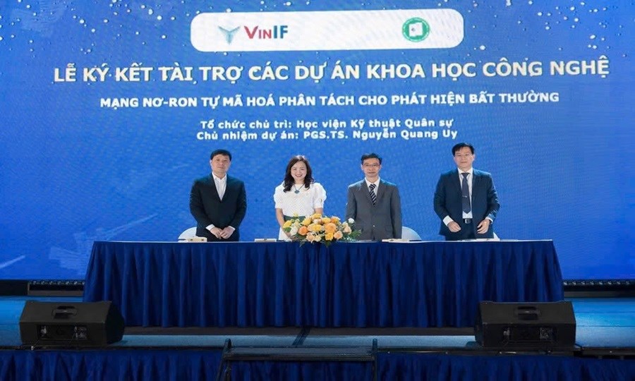 | PGS, TS Nguyễn Quang Uy (thứ hai từ phải sang) tại Lễ ký kết tài trợ các dự án khoa học-công nghệ với Quỹ VINIF. Ảnh do nhân vật cung cấp |