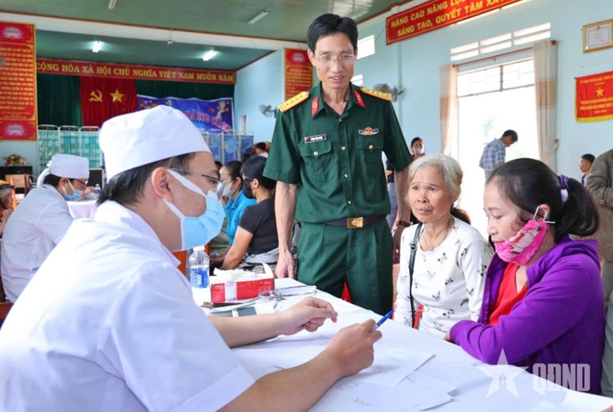 Đại tá, bác sĩ Hoàng Tiến Dũng theo dõi, kiểm tra công tác khám bệnh cho người dân tại chương trình phối hợp quân dân y, tháng 9-2025.