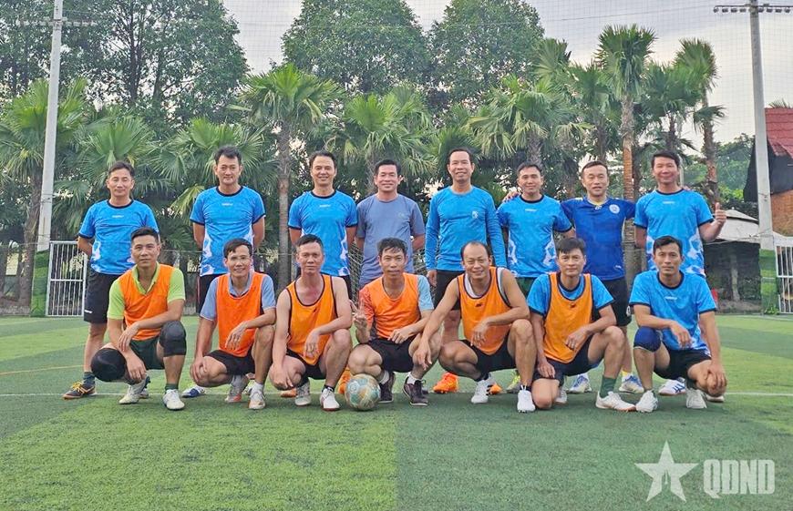 | Thầy Lê Thanh (áo xám, đứng giữa) tham gia giao lưu thể thao cùng học viên lớp đào tạo ngắn chính ủy, trung lữ đoàn K27 tại Trường Quân sự Quân khu 7. |