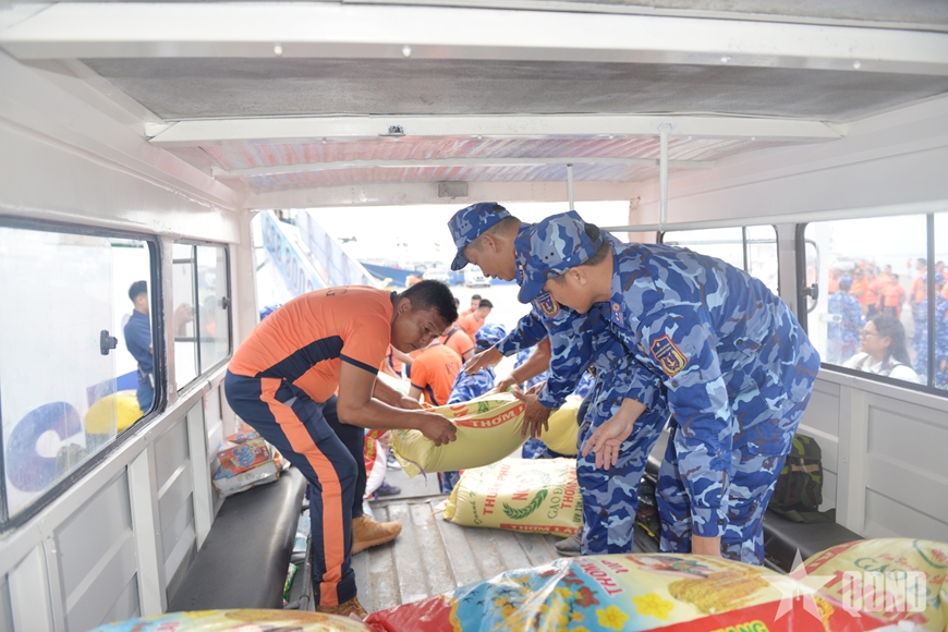 Trong ngày 8-10, cán bộ, chiến sĩ đoàn công tác Cảnh sát biển Việt Nam đã phối hợp với cán bộ, nhân viên Lực lượng Bảo vệ bờ biển Philippines hành quân hơn 100km từ vị trí Tàu CSB 8002 neo đậu đến tỉnh Bogo - nơi người dân địa phương đang chịu hậu quả nặng nề của động đất để thực hiện hoạt động hỗ trợ.
