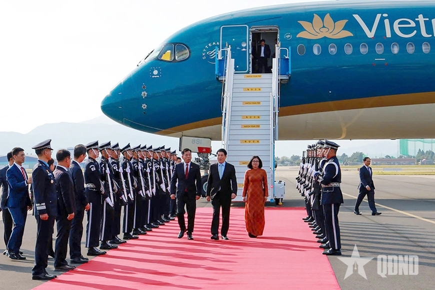 | Lễ đón Chủ tịch nước Lương Cường tại sân bay quân sự Gimhae ở thành phố Busan, Hàn Quốc. |
