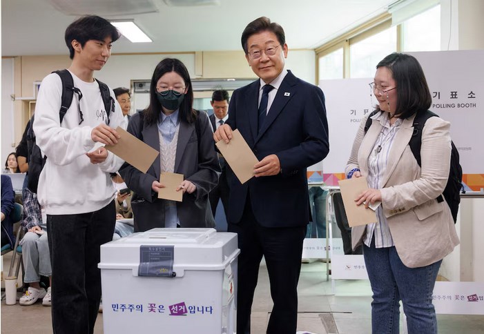 | Ông Lee Jae Myung, ứng cử viên Tổng thống của Đảng Dân chủ tham gia bỏ phiếu sớm tại một điểm bỏ phiếu ở Seoul, Hàn Quốc. Ảnh: Reuters |