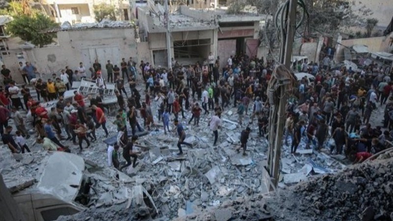 Người dân Palestine đứng giữa đống đổ nát của những tòa nhà bị phá hủy sau đòn không kích của Israel tại khu vực Al-Rimal, phía tây thành phố Gaza ngày 30-8-2025. Ảnh: THX/TTXVN |