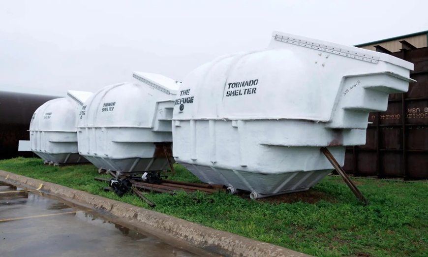 Những hầm trú ẩn chống lốc xoáy được nhìn thấy bên ngoài nhà máy Atlas Survival Shelters ở Sulphur Springs, Texas, ngày 7-3-2026. Ảnh: liberation.fr |