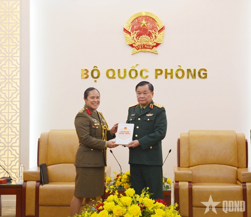 Thượng tướng Hoàng Xuân Chiến trao Sách trắng Quốc phòng Việt Nam năm 2019 tặng Đại tá Alana Burkitt. |