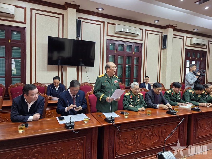Đại tá Nguyễn Cao Cử, nguyên Phó cục trưởng Cục Tác chiến, Bộ Tổng Tham mưu, Phó trưởng ban Thường trực Ban liên lạc truyền thống hữu nghị Việt Nam - Lào phát biểu tại buổi gặp mặt. |