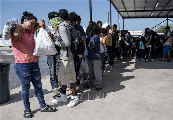 Người di cư từ Mexico chờ lên xe buýt để được trung chuyển khỏi bang Texas, Mỹ. |