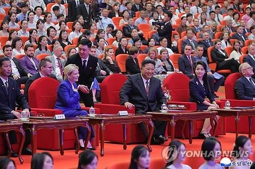Nhà lãnh đạo Triều Tiên Kim Jong-un (giữa) và Bộ trưởng Văn hóa Nga Olga Lyubimova (trái) tại một buổi biểu diễn nghệ thuật ở Bình Nhưỡng, Triều Tiên ngày 29-6. Ảnh: Yonhap