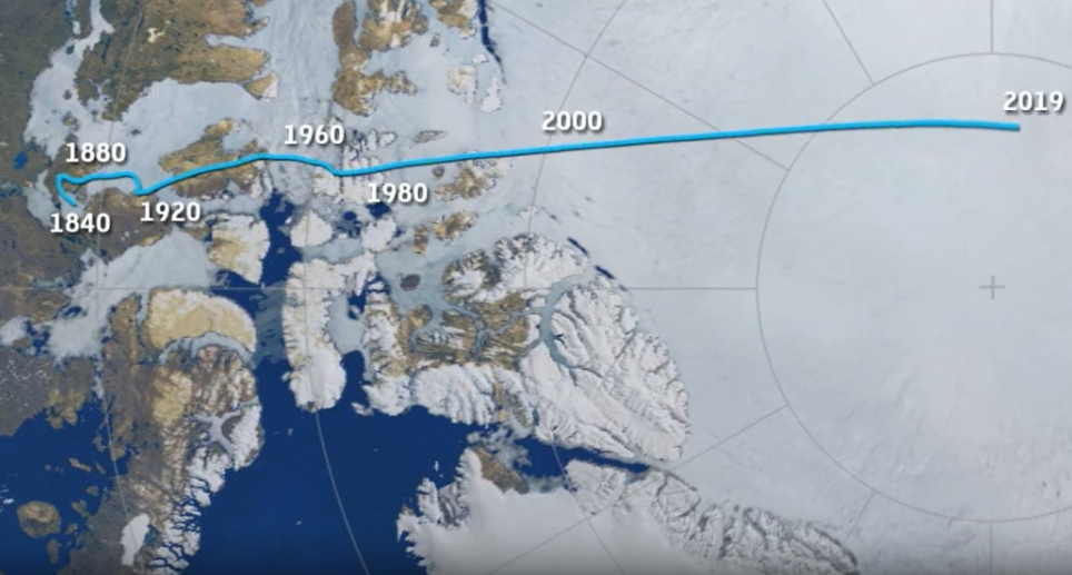 Sự dịch chuyển của cực Bắc từ năm 1840 đến năm 2019. Ảnh: ESA