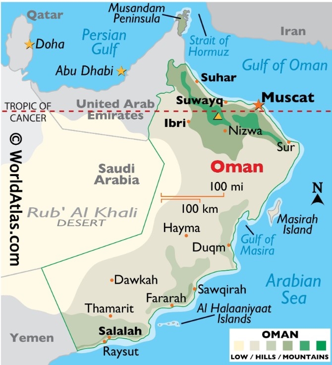Oman có vị trí độc đáo trong khu vực vùng Vịnh. Ảnh: worldatlas.com |