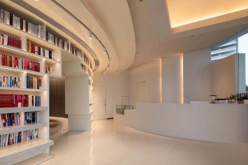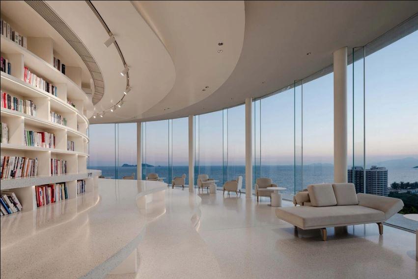Khu vực đọc sách trong nhà chủ yếu có tone màu trắng, xám nhạt, be trong khi hình dạng cong được sử dụng để tăng thêm bầu không khí yên tĩnh. Dọc theo bức tường kính bên ngoài, ghế sofa và bàn nhỏ được đặt sẵn để du khách tận hưởng những cuốn sách yêu thích trong khi ngắm cảnh biển.