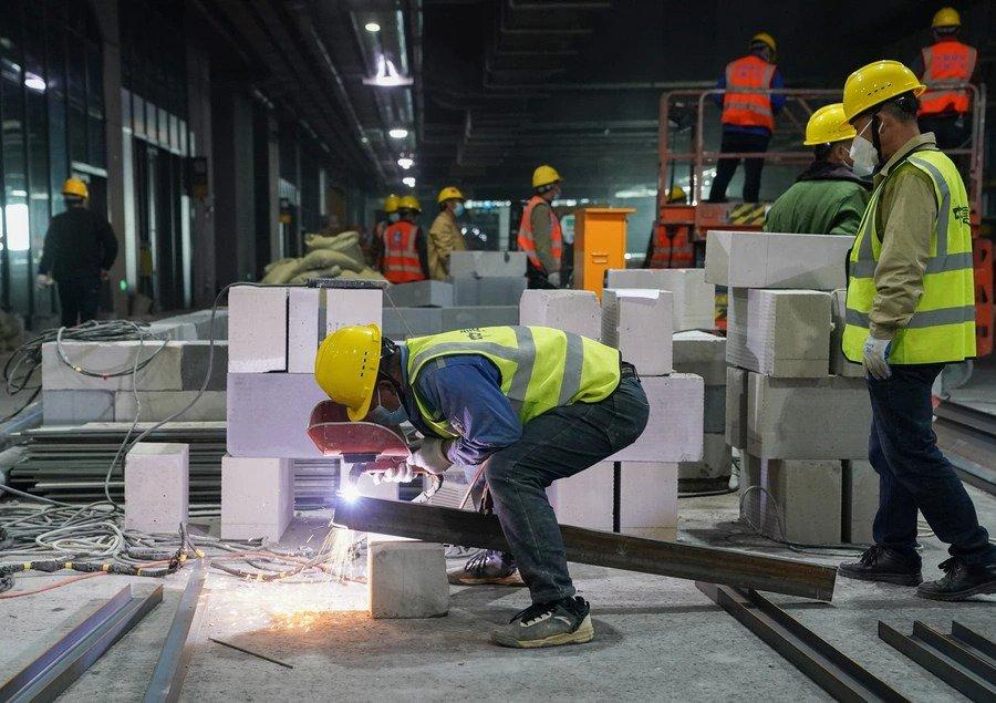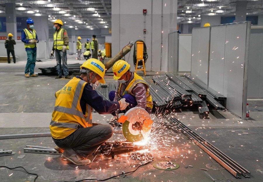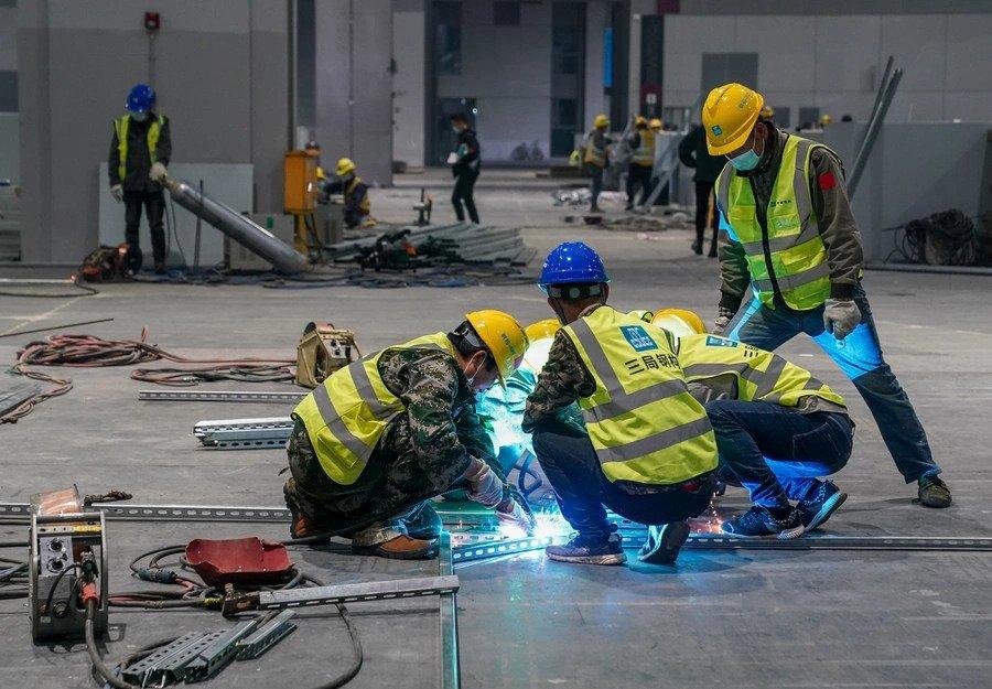 Trong ảnh, các công nhân đang làm việc tại Trung tâm Hội nghị và Triển lãm Quốc gia ở Thượng Hải, phía đông Trung Quốc, ngày 6/4. Sau khi hoàn thành, nơi đây sẽ trở thành bệnh viện lớn nhất điều trị bệnh nhân mắc Covid-19 trong thành phố.