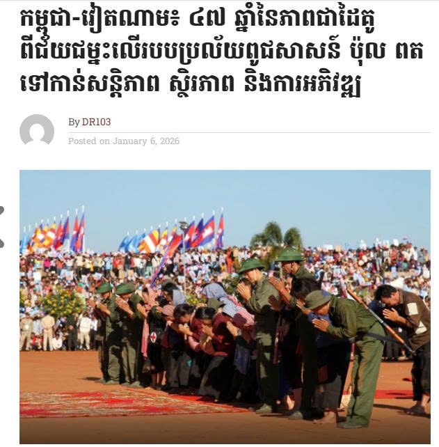Theo bài viết, cách đây 47 năm, vào ngày 7-1-1979, các lực lượng yêu nước, dưới sự lãnh đạo của “Mặt trận Đoàn kết cứu quốc Campuchia”, tiền thân của “Mặt trận Đoàn kết phát triển Tổ quốc Campuchia” hiện nay, với sự hỗ trợ của Quân tình nguyện Việt Nam, đã tiến vào giải phóng Phnom Penh, lật đổ chế độ diệt chủng Pol Pot. Chiến thắng lịch sử Ngày 7-1 đã kịp thời giải cứu hơn 5 triệu người dân Campuchia khỏi chế độ diệt chủng tàn bạo của tập đoàn Khmer Đỏ do Pol Pot cầm đầu - đã sát hại hơn 3 triệu người dân vô tội trong suốt thời gian cầm quyền (1975-1979).