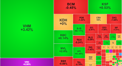 Tuy nhiên, sự thận trọng của nhà đầu tư khiến thanh khoản giảm xuống mức thấp. Toàn sàn chỉ đạt chưa đầy 17.500 tỷ đồng, thấp hơn mức gần 20.000 tỷ đồng phiên cuối tuần trước. Không mã nào vượt 1.000 tỷ đồng giá trị giao dịch; cao nhất là VRE với hơn 895 tỷ đồng. Khối ngoại bán ròng mạnh khi mua 1.734 tỷ đồng nhưng bán ra hơn 2.887 tỷ đồng.