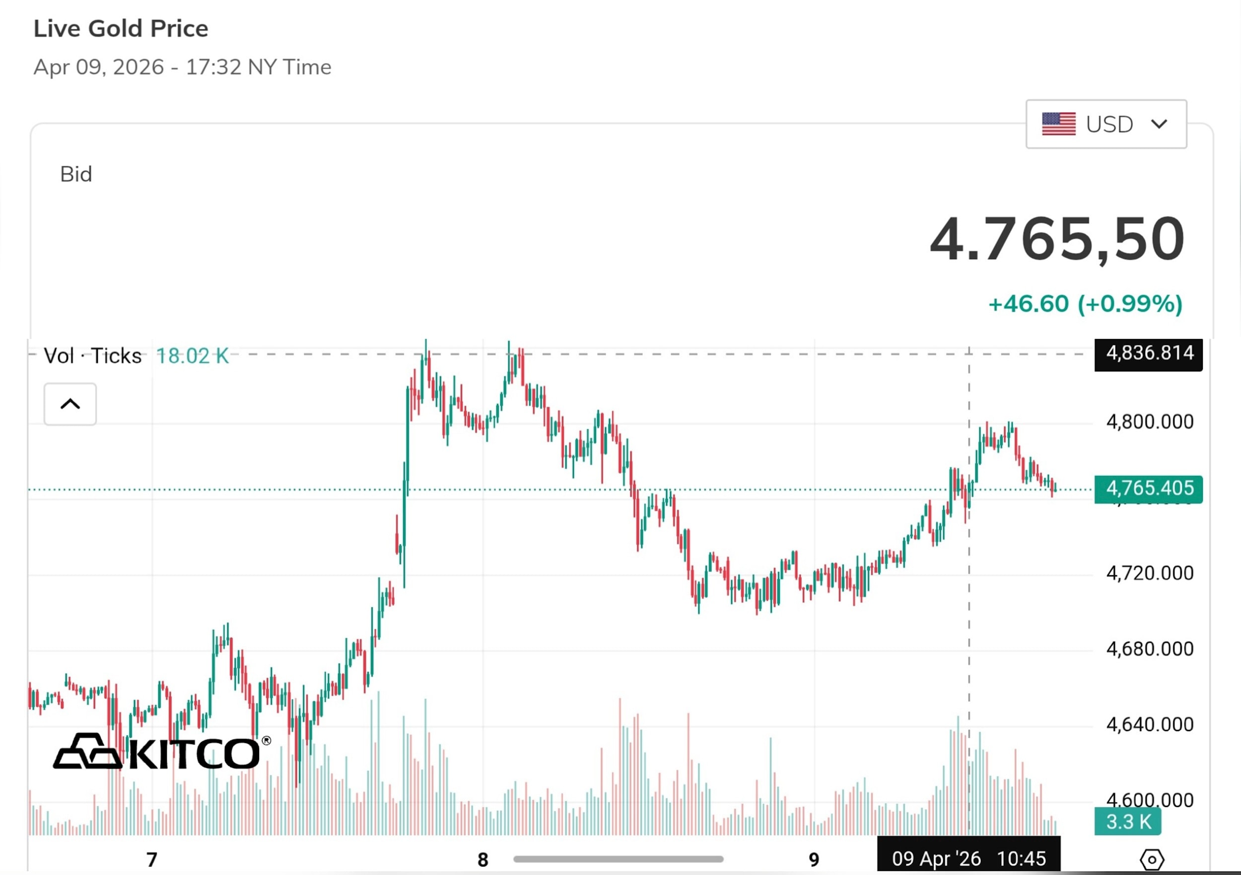 Theo Kitco news, giá vàng thế giới 4h50 sáng nay (theo giờ Việt Nam) giao dịch ở mức 4.765,5 USD/ounce. Giá vàng thế giới tăng 46,6 USD/ounce (0,99%) so với hôm qua. Quy đổi theo tỷ giá USD tại ngân hàng Vietcombank (26.357VND/USD), vàng thế giới có giá khoảng 151,5 triệu đồng/lượng (chưa tính thuế, phí). Như vậy, giá vàng miếng SJC đang cao hơn giá vàng quốc tế khoảng 20 triệu đồng/lượng.