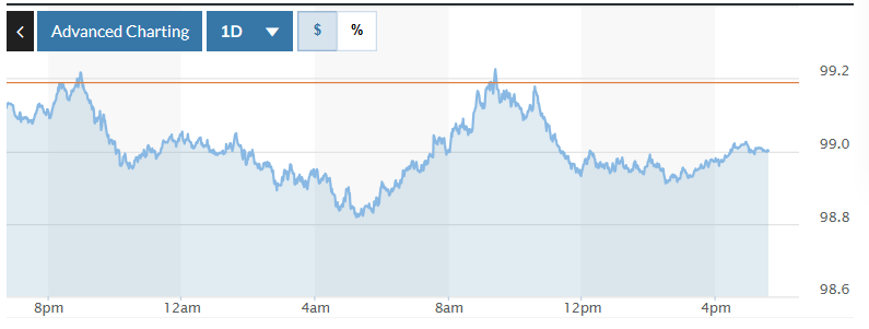 Trong khi đó, trên thị trường Mỹ, chỉ số US Dollar Index (DXY) đo lường biến động đồng bạc xanh với 6 đồng tiền chủ chốt (EUR, JPY, GBP, CAD, SEK, CHF) giảm 0,19%, về mức 99,00.