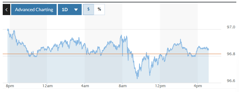 Trên thị trường Mỹ, chỉ số US Dollar Index (DXY) đo lường biến động đồng bạc xanh với 6 đồng tiền chủ chốt (EUR, JPY, GBP, CAD, SEK, CHF) giảm nhẹ, hiện ở mức 96,85.