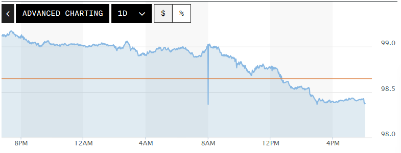 Biểu đồ biến động Chỉ số DXY trong 24 giờ qua. Ảnh: Market watch |