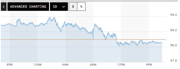| Biểu đồ biến động Chỉ số DXY trong 24 giờ qua. Ảnh: Market watch |