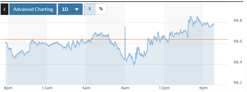 Trên thị trường Mỹ, chỉ số US Dollar Index (DXY) đo lường biến động đồng bạc xanh với 6 đồng tiền chủ chốt (EUR, JPY, GBP, CAD, SEK, CHF) tăng 0,14%, hiện ở mức 98,78.