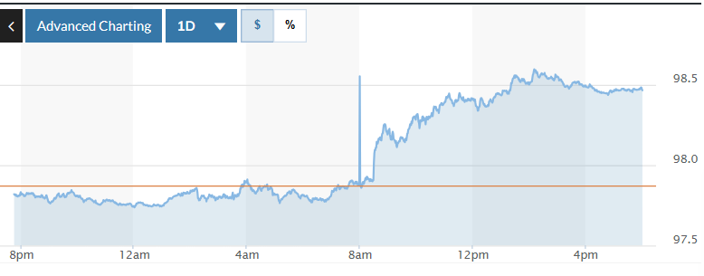 Biểu đồ biến động Chỉ số DXY trong 24 giờ qua. Ảnh: Marketwatch |