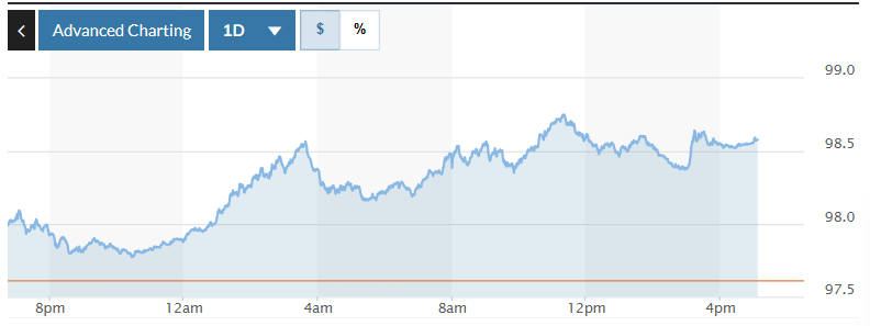 Trên thị trường Mỹ, chỉ số US Dollar Index (DXY) đo lường biến động đồng bạc xanh với 6 đồng tiền chủ chốt (EUR, JPY, GBP, CAD, SEK, CHF) tăng 0,99%, hiện ở mức 98,57.