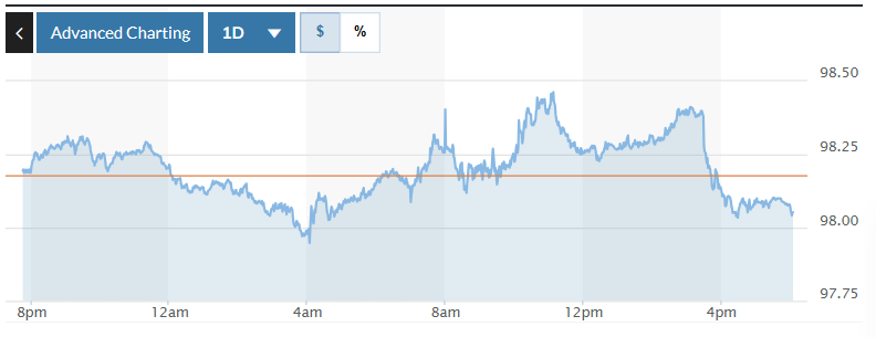 Trong khi đó, trên thị trường Mỹ, chỉ số US Dollar Index (DXY) đo lường biến động đồng bạc xanh với 6 đồng tiền chủ chốt (EUR, JPY, GBP, CAD, SEK, CHF) giảm 0,13%, hiện ở mức 98,05.