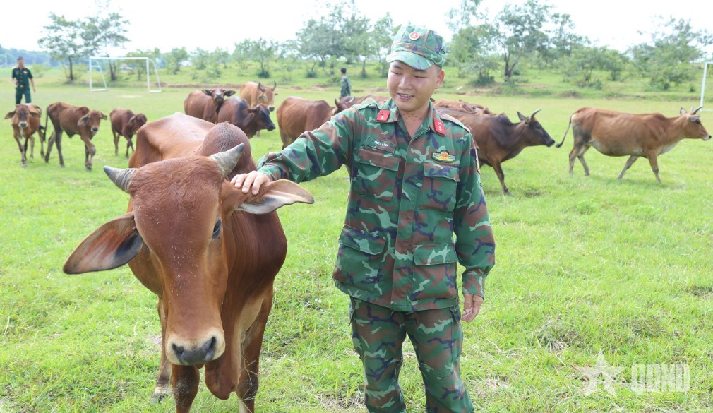 | Chiến sĩ chăm sóc đàn bò. |