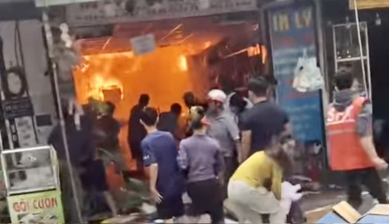 | Đám cháy lớn có nguy cơ lan sang các hộ kinh doanh liền kề. |