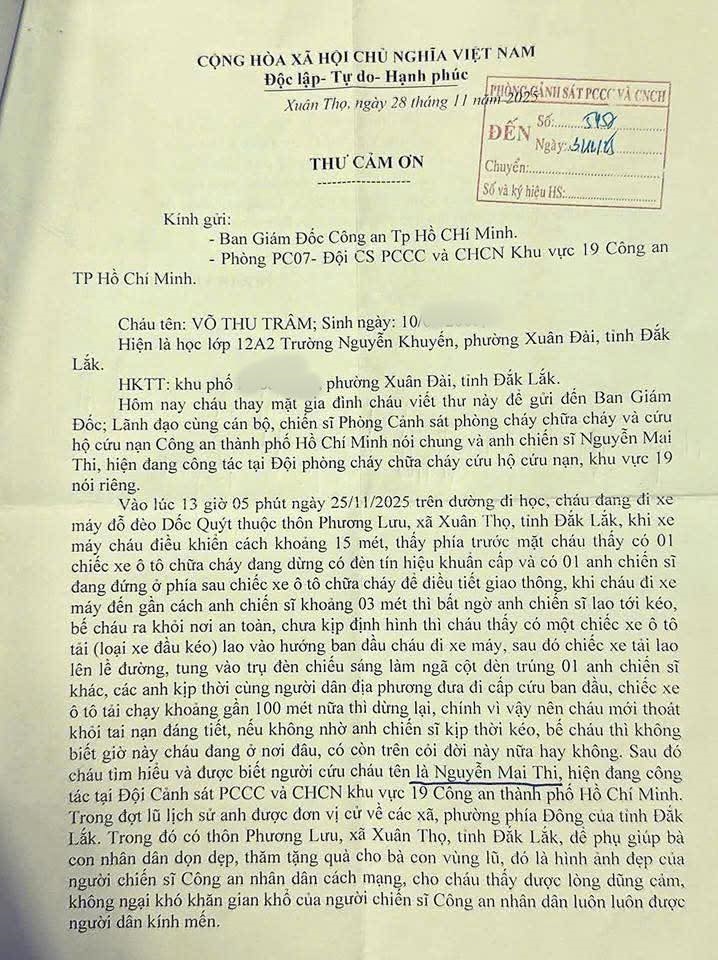"Nếu không nhờ anh chiến sĩ kịp thời kéo cháu thì không biết giờ này cháu đang ở nơi đâu, có còn trên cõi đời này nữa hay không", học sinh Võ Thu Trâm viết thư cảm ơn Công an TP Hồ Chí Minh, Phòng Cảnh sát Phòng cháy, chữa cháy và Cứu nạn, cứu hộ và đồng chí Nguyễn Mai Thi. |