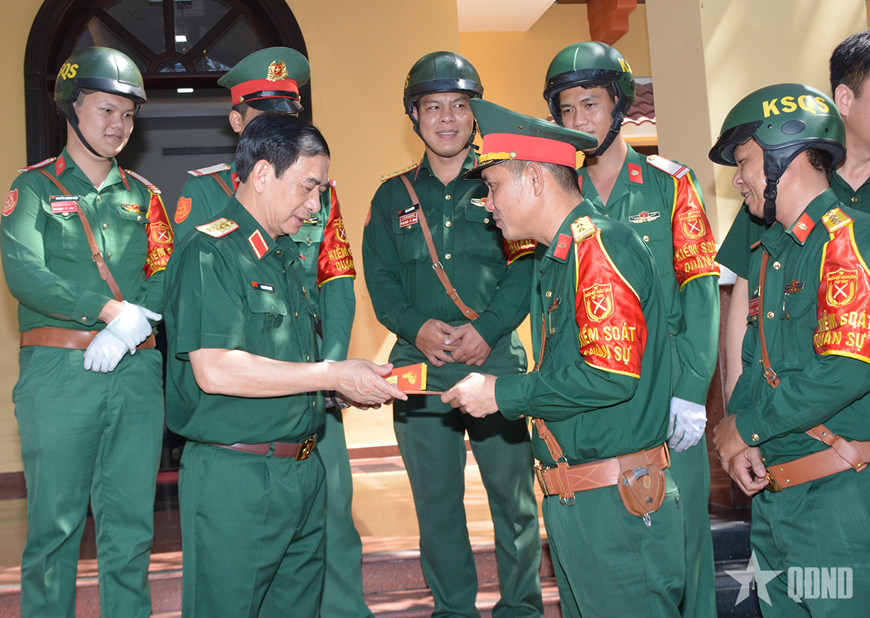 | Đại tướng Phan Văn Giang lì xì cán bộ, chiến sĩ Tiểu đoàn Vệ binh - Kiểm soát quân sự 31, Bộ tư lệnh TP Hồ Chí Minh (Quân khu 7). |