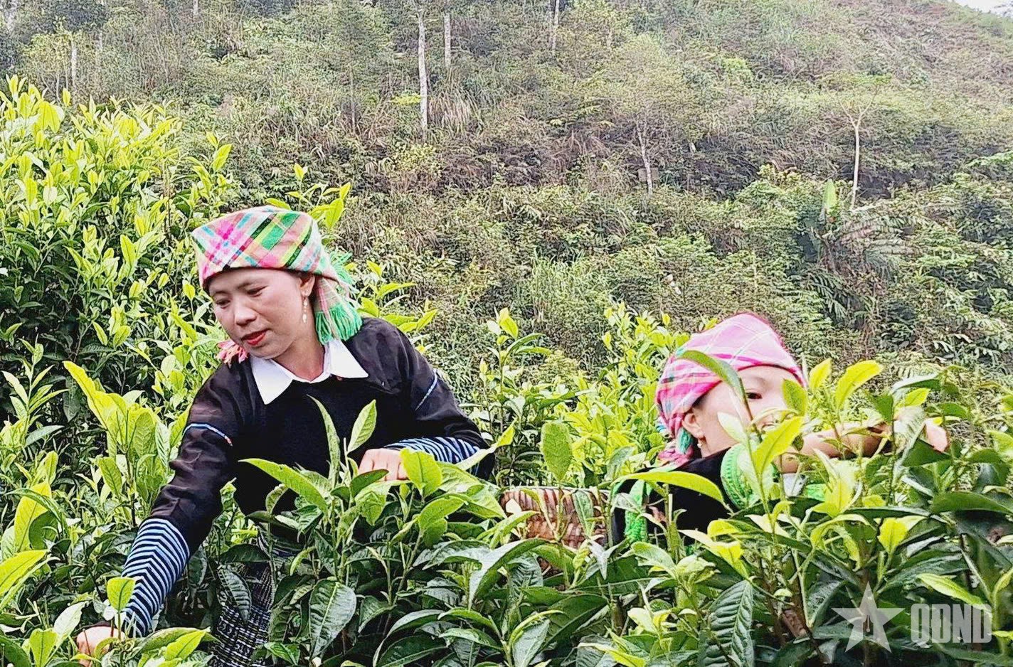 | Người dân thôn Làng Mảnh thu hoạch chè. |