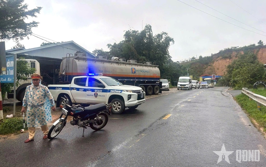Lực lượng cảnh sát giao thông Công an tỉnh Lâm Đồng phân luồng giao thông tại khu vực đèo Ngoạn Mục trưa 19-11. Ảnh CTV