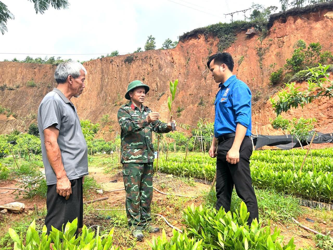 | Trung tá QNCN Nguyễn Quang Vinh hướng dẫn đồng bào kỹ thuật trồng cây. |