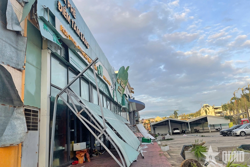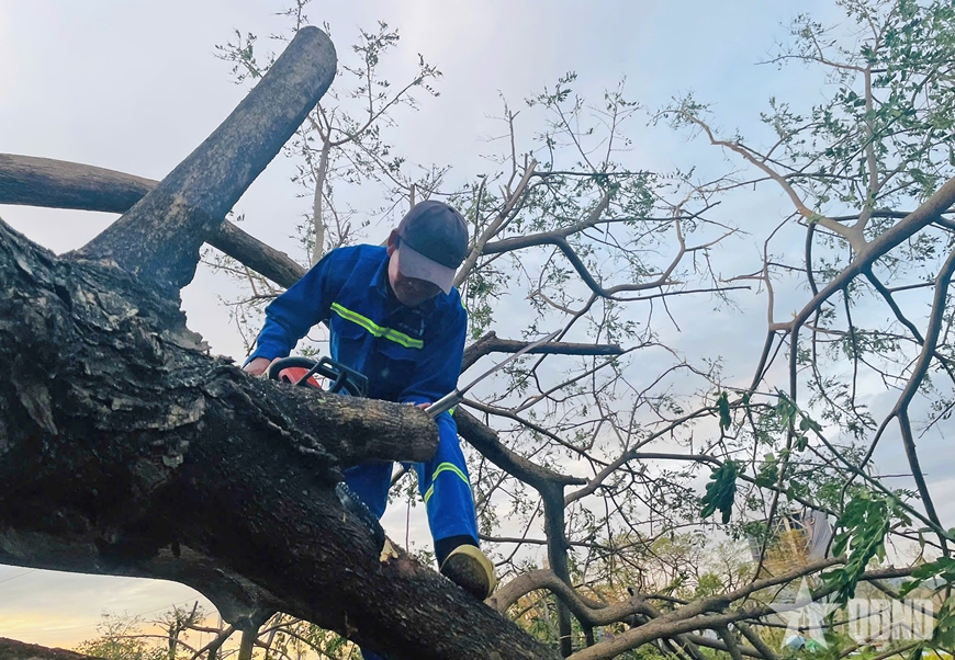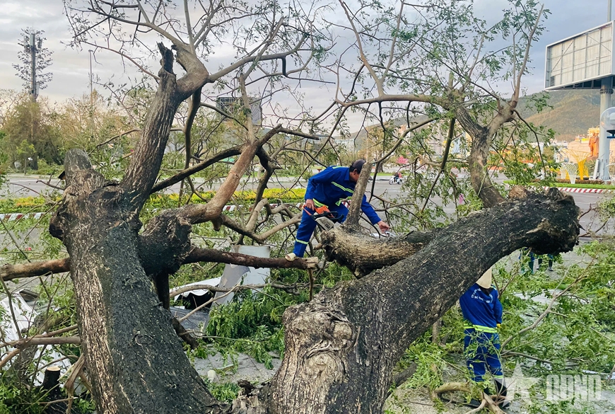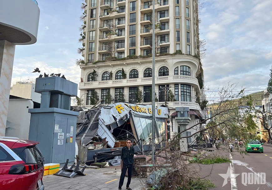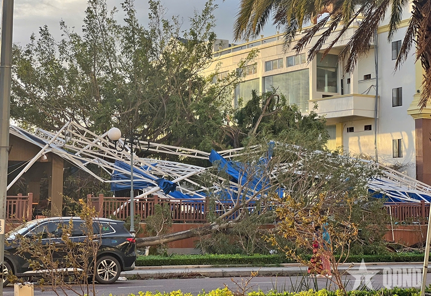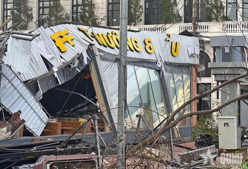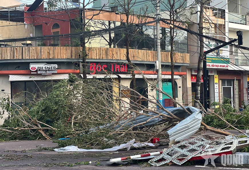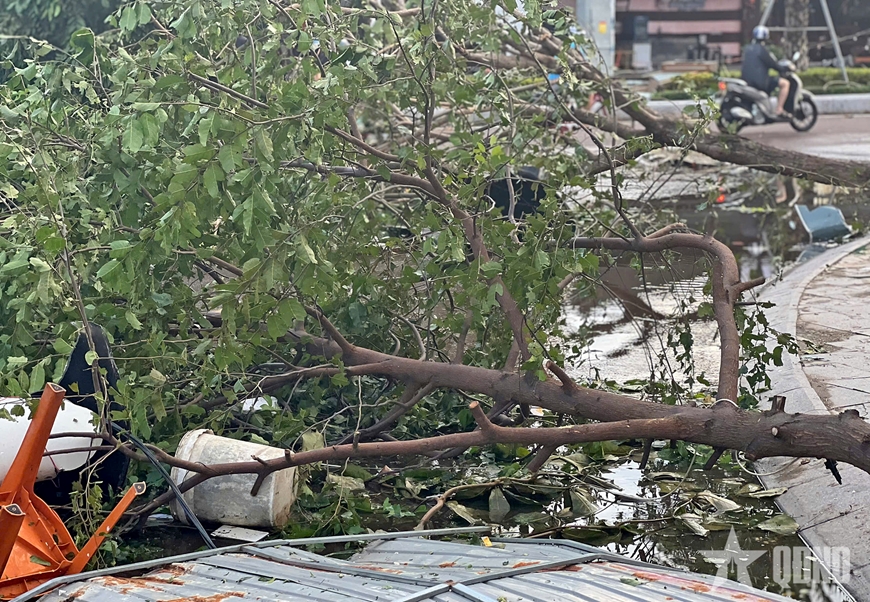 Cây xanh ngã đổ, mái tôn sập, móp méo, ngổn ngang trên phố.