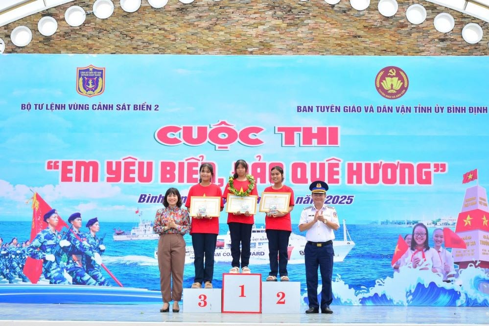 Lãnh đạo Vùng Cảnh sát biển 2 trao quà và bằng chứng nhận tặng các học sinh đoạt giải trong Cuộc thi “Em yêu biển, đảo quê hương”. |