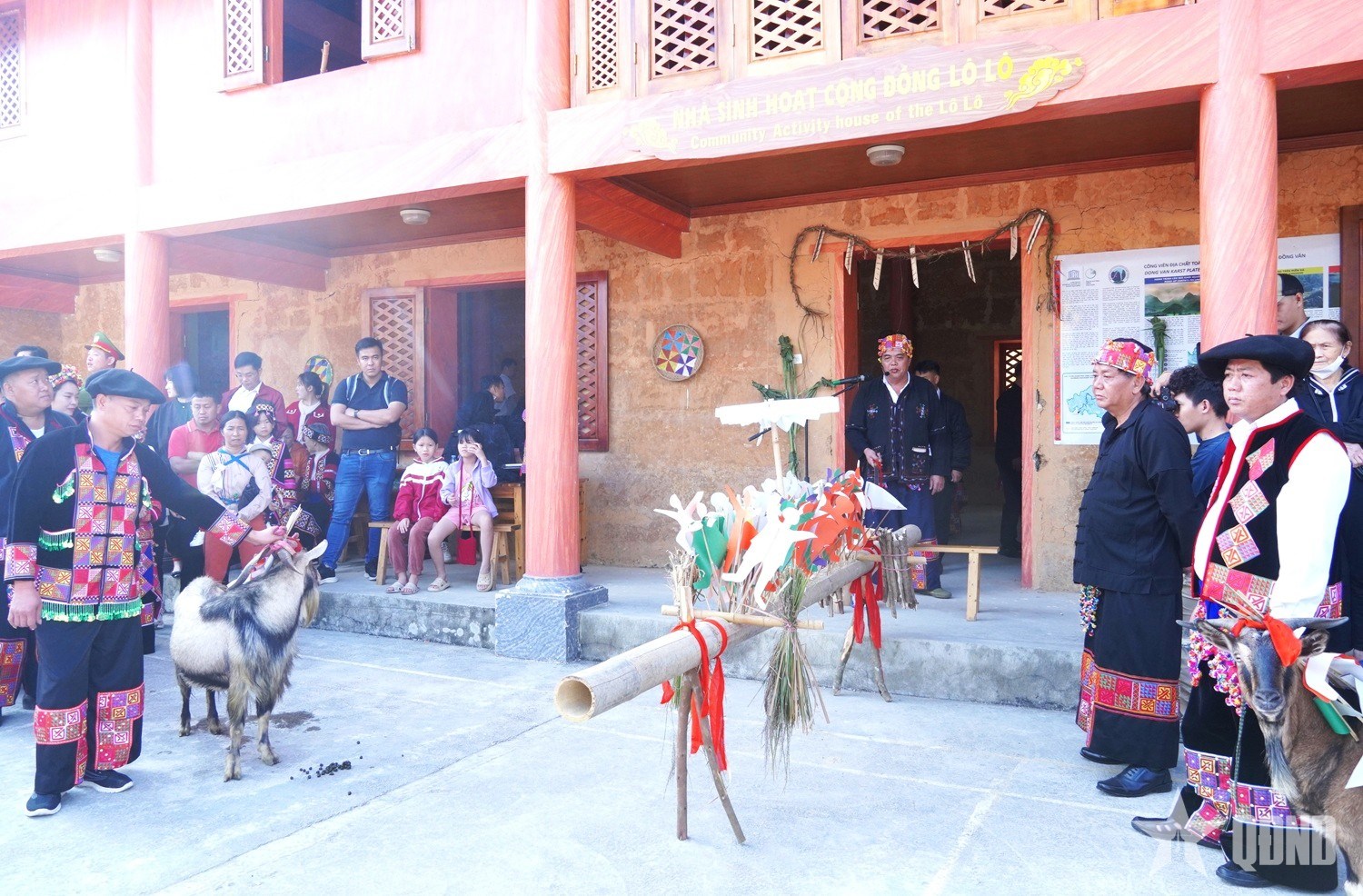 | Người dân tộc Lô Lô thực hành Lễ hội Cầu mưa tại Nhà sinh hoạt cộng đồng. |