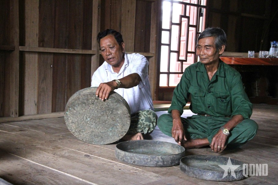 | Già làng Y Dhun (bên trái) luôn quan tâm bảo tồn bản sắc văn hóa của dân tộc Ê Đê. |