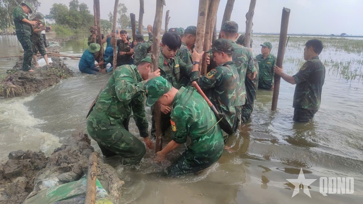 Ngay lập tức, 50 cán bộ, chiến sĩ các đơn vị được huy động cùng phương tiện, vật tư khẩn cấp triển khai công tác xử lý. Cán bộ, chiến sĩ đã sử dụng lưới B40 kết hợp với bạt nylon chống thấm và bao tải đất để ngăn dòng nước, gia cố thân đê. Sau hơn hai giờ nỗ lực vật lộn trong điều kiện nước lũ dâng cao và thời tiết khắc nghiệt, sự cố vỡ đê bao đã được khắc phục, bước đầu ngăn chặn được dòng nước tràn vào khu vực sản xuất. Đồng thời, tại các vị trí xung yếu khác, cán bộ, chiến sĩ tiếp tục phối hợp với chính quyền và nhân dân địa phương gia cố, đắp cao mặt đê, bảo đảm an toàn cho toàn tuyến.