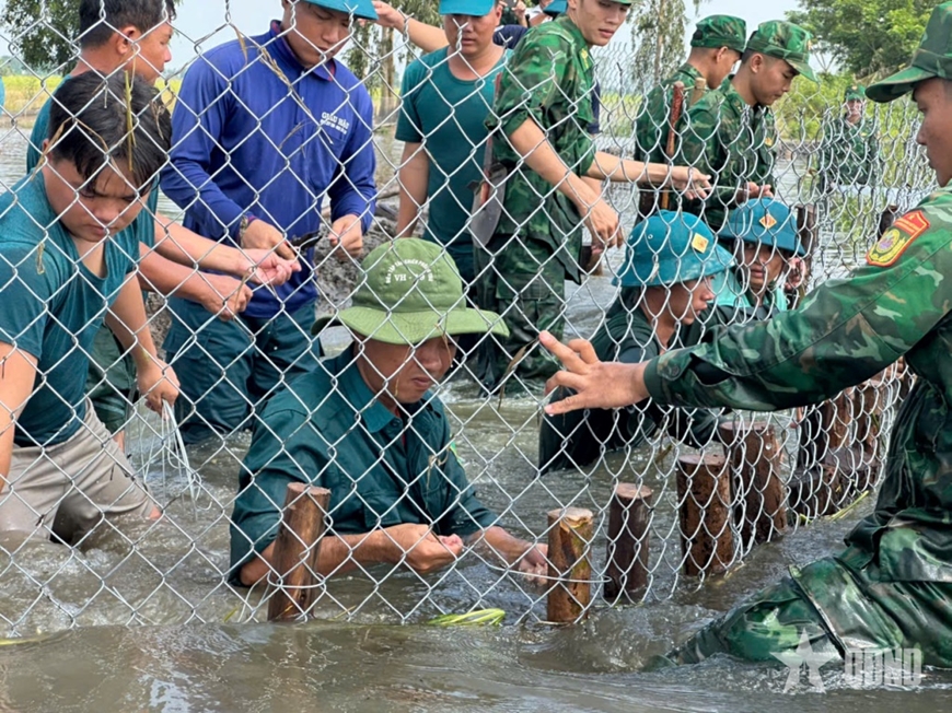 Cán bộ, chiến sĩ các đơn vị gia cố đê bao tại ấp Gò Pháo.