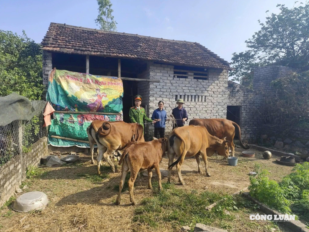 Đại diện công an xã Thần Lĩnh bàn giao đàn bò cho gia đình anh Thành. Ảnh: Kim Long