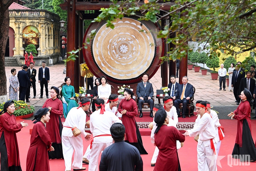 Tại không gian chính điện Kính Thiên, Tổng Bí thư, Chủ tịch nước Tô Lâm và Tổng thống Hàn Quốc Lee Jae Myung cùng hai phu nhân đã nghe giới thiệu ý nghĩa của khu vực này, chính là nơi vua và các quan đại thần luận bàn việc nước, thiết triều, tiếp đón sứ giả nước ngoài và cử hành các nghi lễ quan trọng của triều đình trong 800 năm tại Kinh đô Thăng Long.