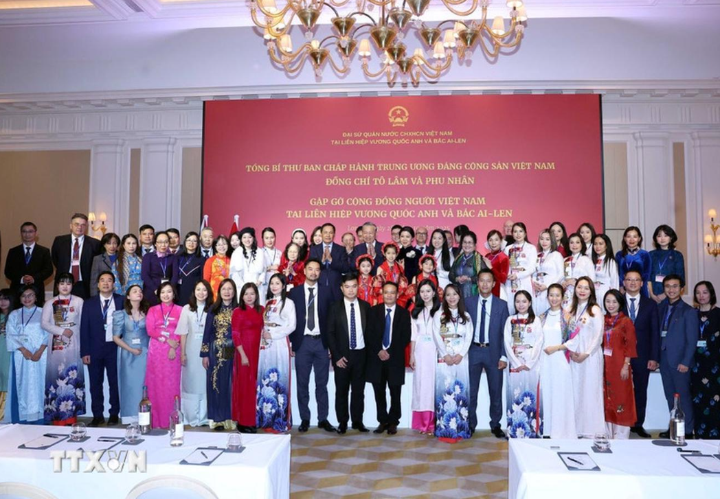 Tổng Bí thư Tô Lâm và Phu nhân với cộng đồng người Việt Nam tại Anh. Ảnh: TTXVN