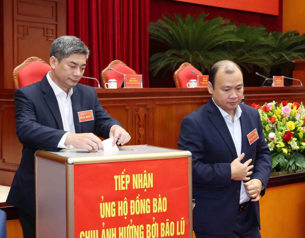 Trưởng Ban Tuyên giáo và Dân vận Trung ương Trịnh Văn Quyết, Chánh Văn phòng Trung ương Phạm Gia Túc quyên góp ủng hộ đồng bào chịu ảnh hưởng bởi bão lũ. Ảnh: TTXVN