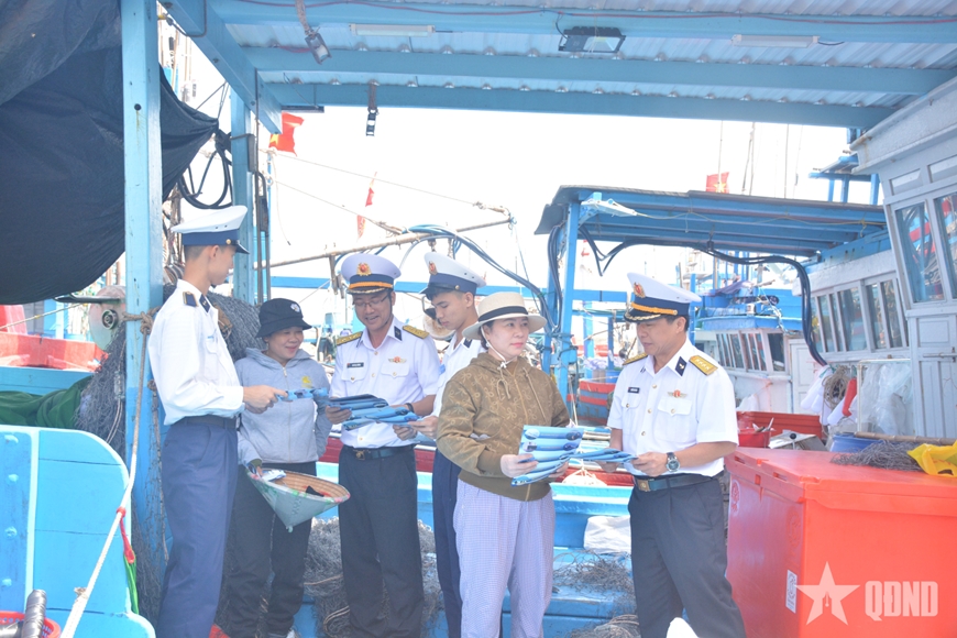 | Cán bộ, học viên Học viện Hải quân tuyên truyền về IUU. |